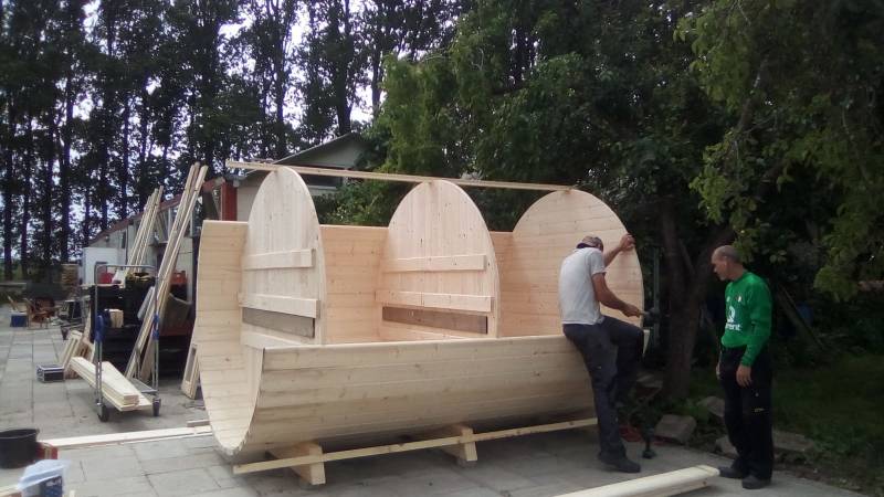 in 2019 hebben het eerste vat opgebouwd als show model. Een groot pak hout dat als bouwpakket in elkaar gezet wordt en een sfeervolle overnachtingsaccommodatie biedt. Binnen vind je een zitje voor twee personen, twee bankjes en een tafel, rekje met wijnglazen en een fles water en een flesje wijn, en een ruimte met een 2 persoonsbed, Een goed matras